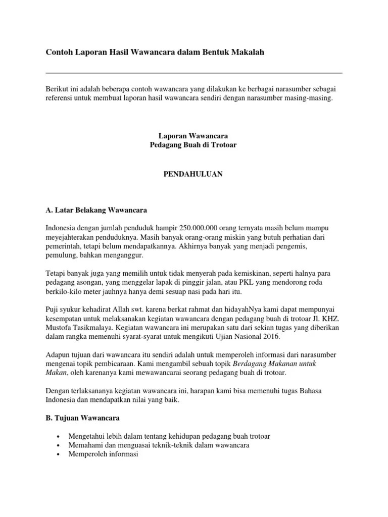 Pengecekan ulang terhadap data yang diperoleh dengan cara meminta para informan dan responden untuk membaca hasil wawancara dengan peneliti. Metode dan teknik penulisan dalam penyusunan makalah ini adalah dengan wawancara secara langsung terhadap narasumber. Dikutip dari buku 'be smart bahasa indonesia' terbitan grafindo media pratama tulisan dalam . Adapun maksud dan tujuan dari penyusunan laporan hasil wawancara ini adalah. Contoh kesimpulan teks laporan hasil wawancara.